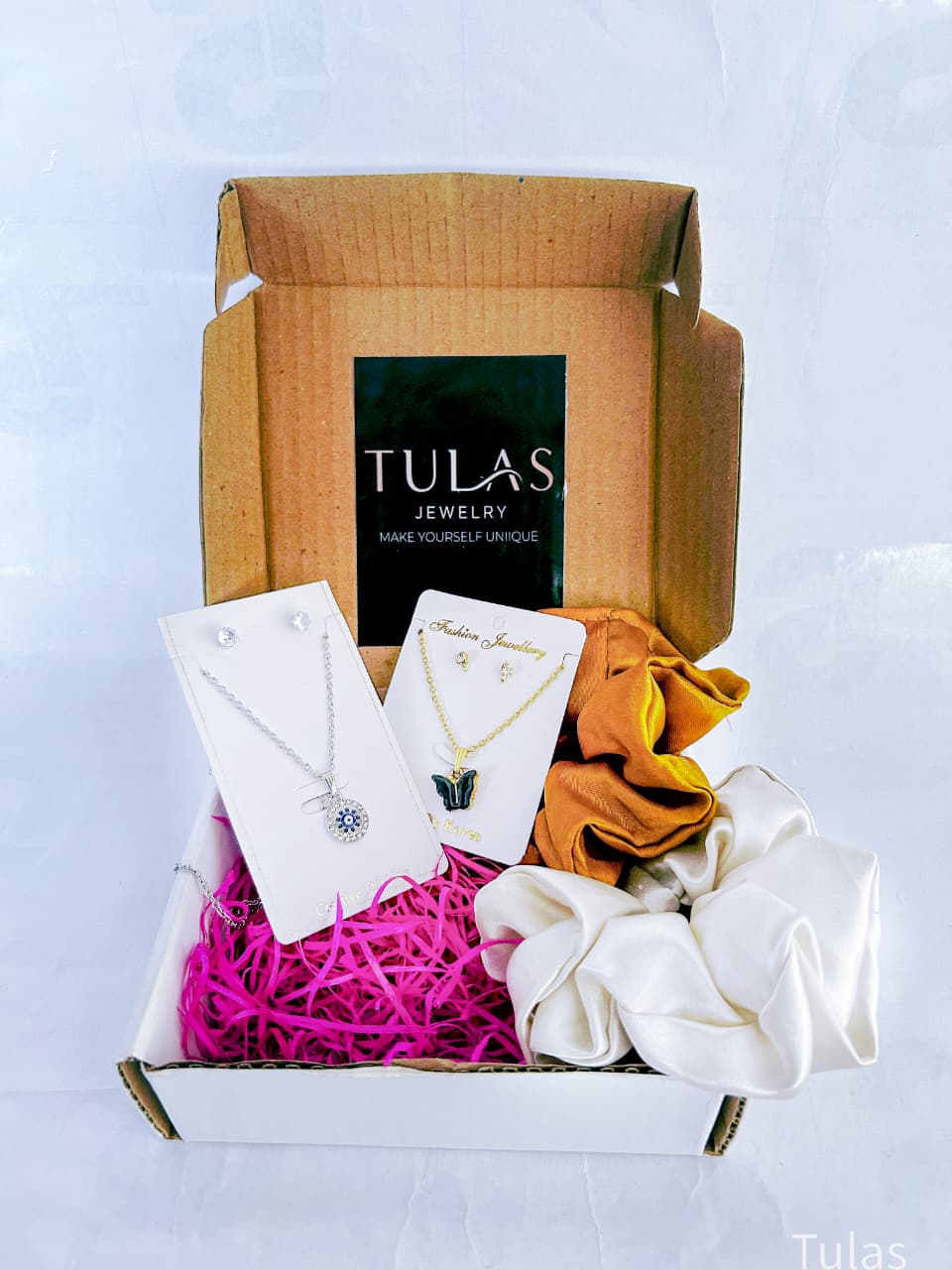 Elevate your daily look with the Everyday Radiance Combo from Tulas Jewelry. This carefully curated set features two distinct necklaces and earring pairs—one in stunning silver-tone with a brilliant pave-set pendant, and another in a delicate gold-tone with a trendy butterfly accent. Complementing the jewelry are two luxurious satin scrunchies (one golden-brown, one crisp white) perfect for effortlessly styling your hair. It’s the ideal gift box for adding a touch of sparkle and softness to any outfit, any day.